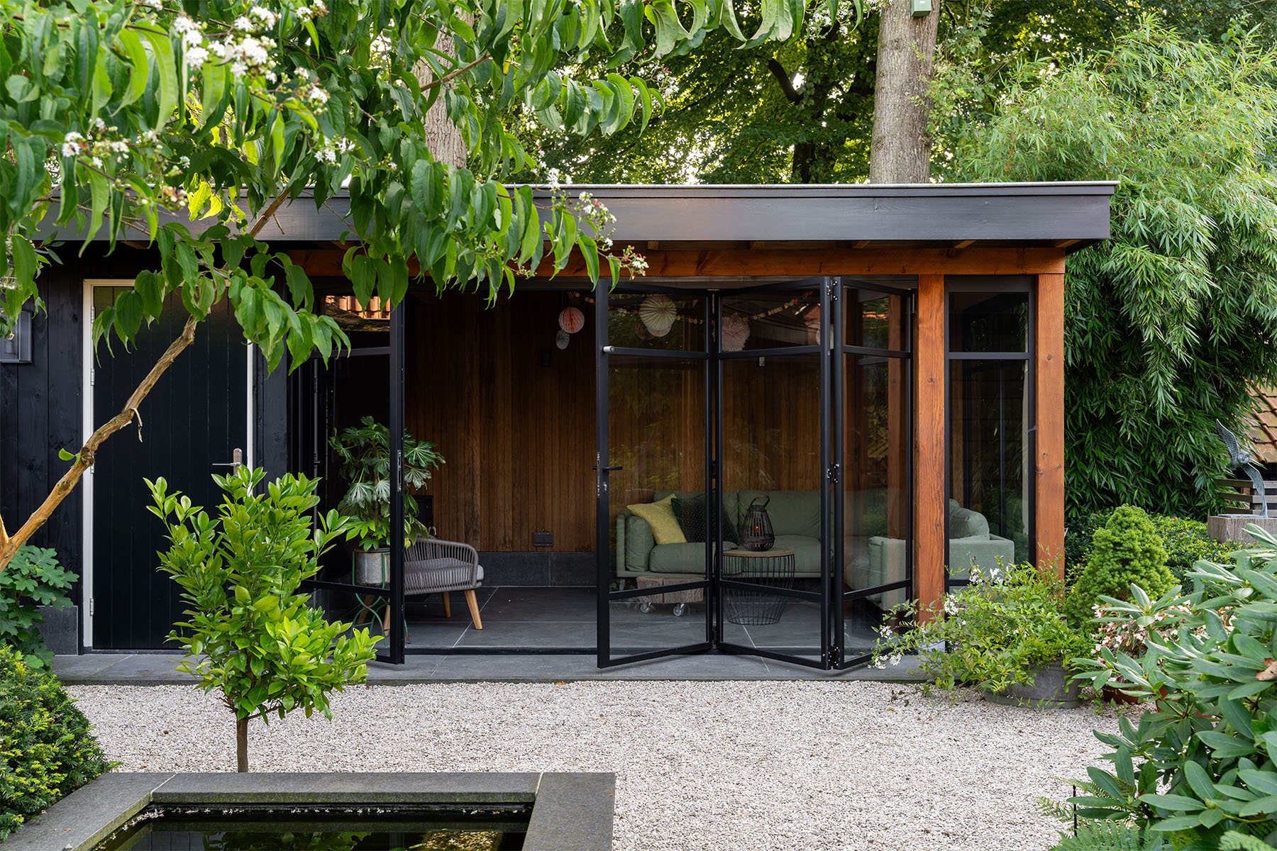 De veranda voelt als een tweede woonkamer. Gemaakt van douglas en fraké hout, met een geïsoleerde schuur, houtkachel, tv, muziek en internet, is dit de perfecte plek om het hele jaar door te genieten.