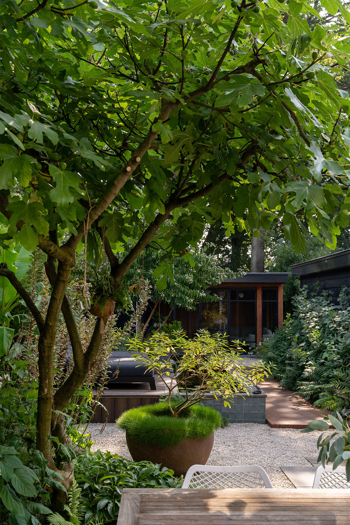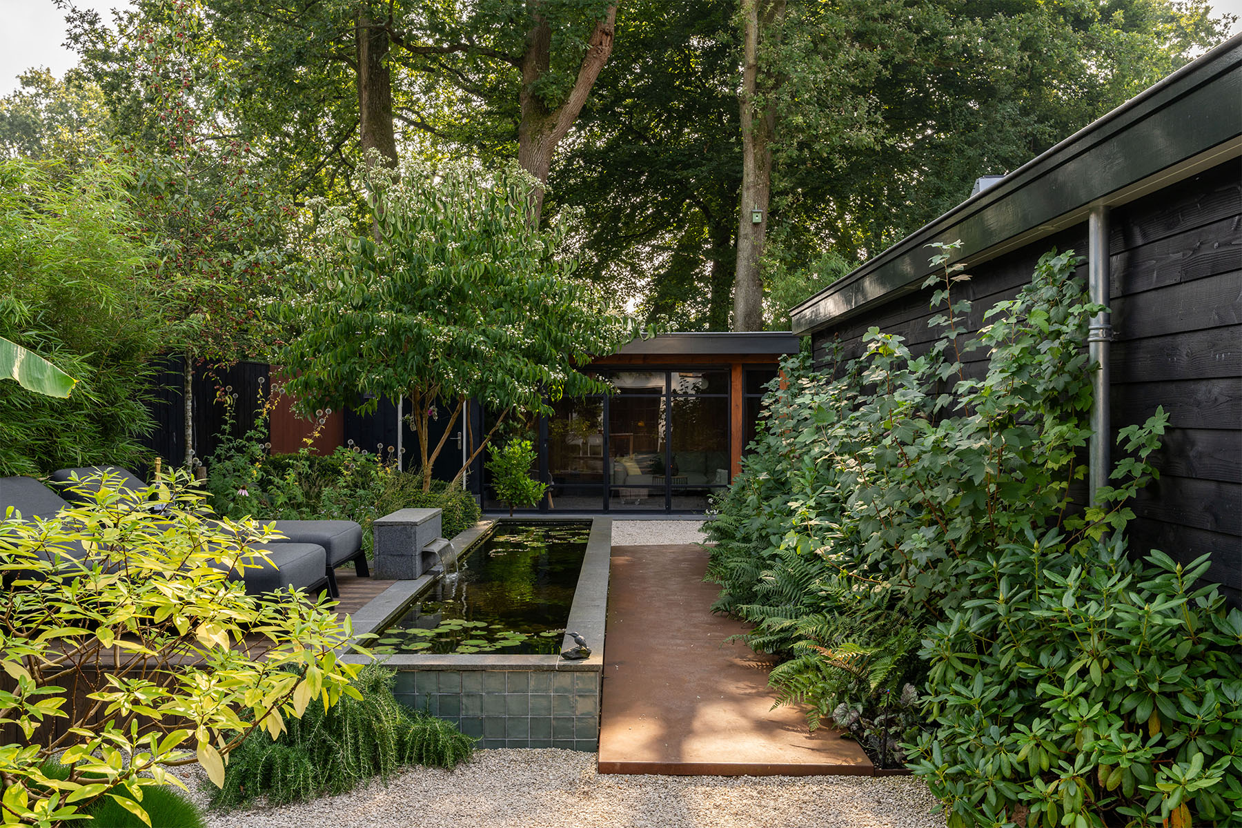 Deze loungetuin combineert groen en luxe. De bronzen beelden van een ijsvogel en een uil sluiten perfect aan bij de natuurlijke omgeving. Dankzij het verhoogde terras met ligstoelen blijft de zon hier langer hangen, ideaal voor ontspanning.