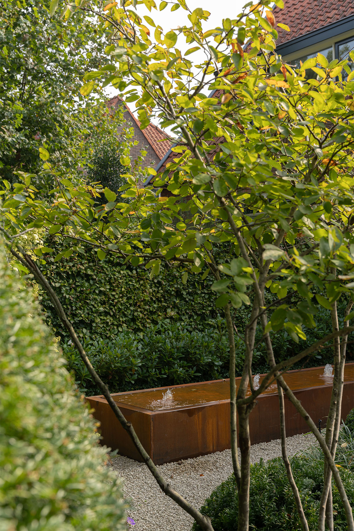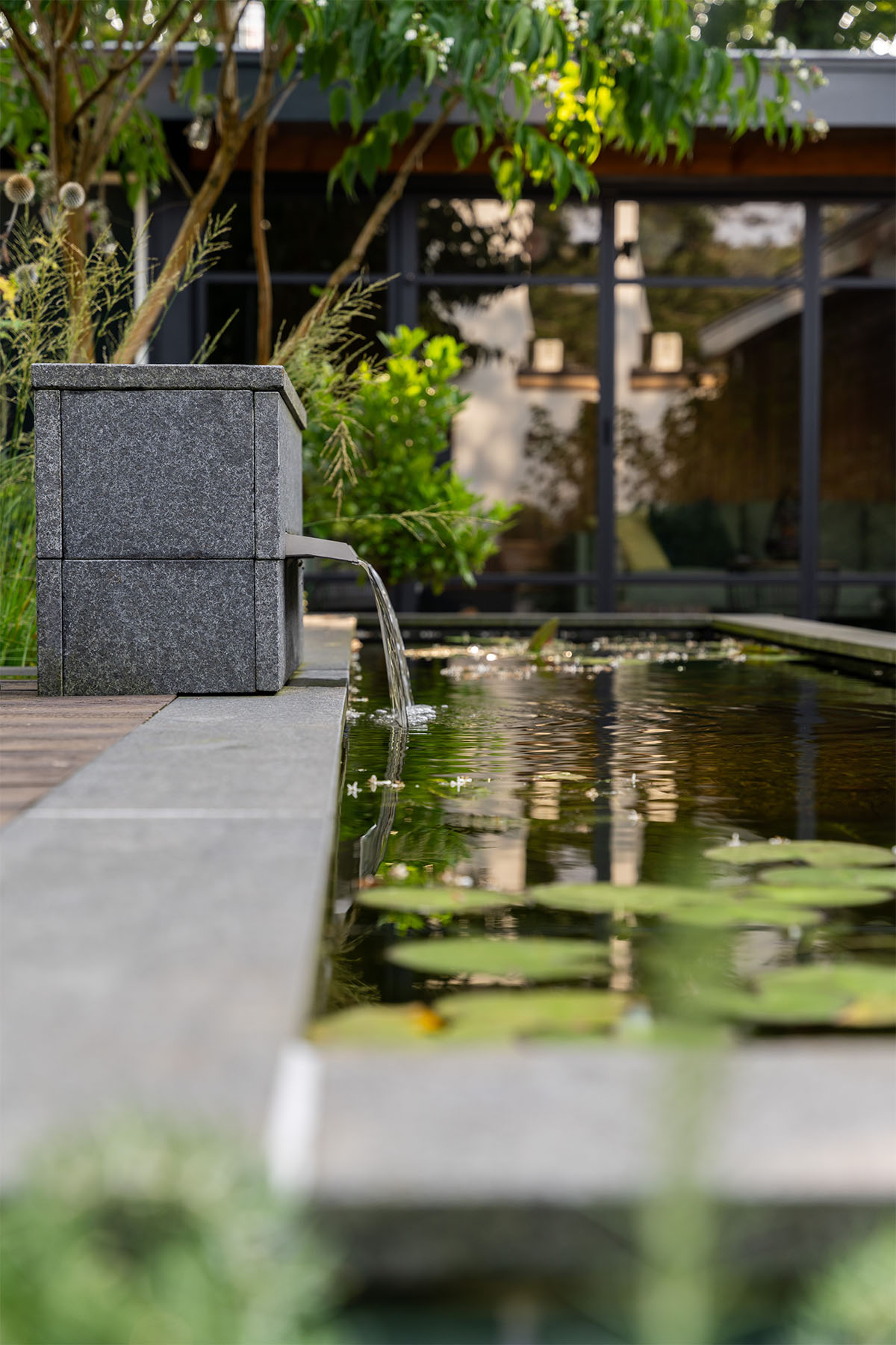 Hoogwaardige materialen geven de tuin een exclusieve uitstraling. Keramische tegels en natuurstenen kasseien zorgen voor een stijlvolle basis, terwijl het Millboard vlonderterras en de RVS-waterval extra diepte en luxe toevoegen.